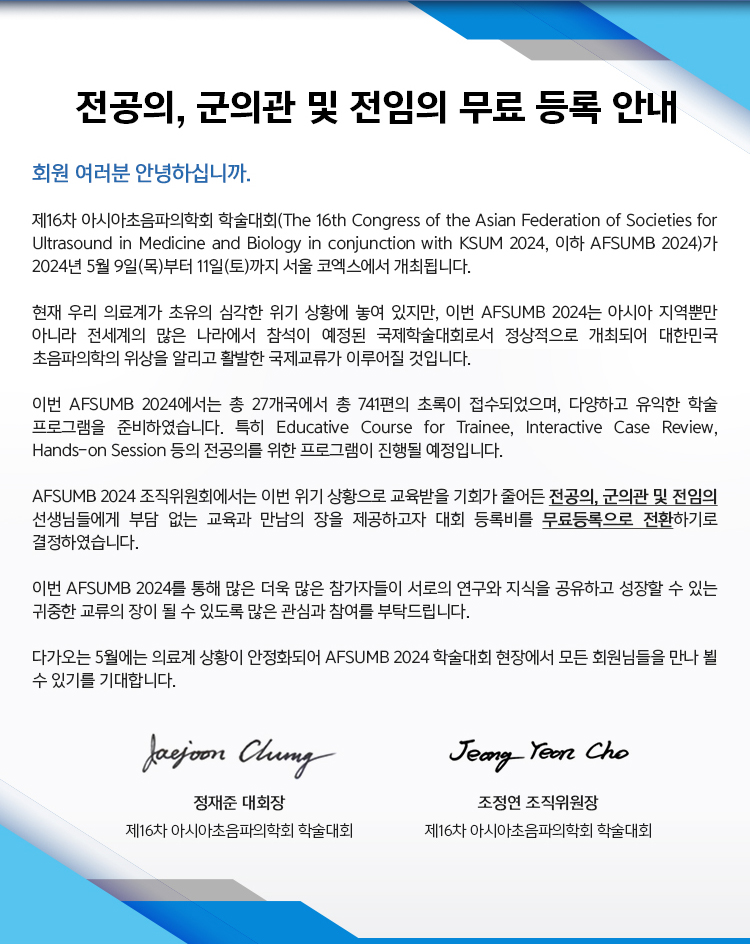 *대한초음파의학회 회원 중 전임의 대상으로도 대회 등록비가 면제되오니, 대회 등록 진행 시 결제 이전 단계(Payment Needed)까지 등록 후 사무국(reg@ksum.or.kr)으로 성함과 대회 ID 를 보내주시면 정보 확인 후 등록 처리해 드리겠습니다.